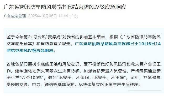 央视网消息:鉴于今年第21号台风“麦德姆”对广东省的影响基本结束,根据《广东省防汛防旱防风防冻应急预案》和省防总有关规定,广东省防汛防旱防风总指挥部已于10月6日14时结束防风Ⅳ级应急响应。