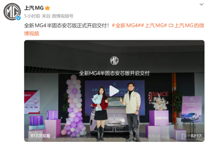 日前,上汽MG官方宣布,全新MG4(查成交价|车型详解)半固态安芯版正式开启交付,新车官方指导价10.28万元,限时补贴价9.98万元,搭载53.9kWh的半固态电池,CLTC续航里程530km。